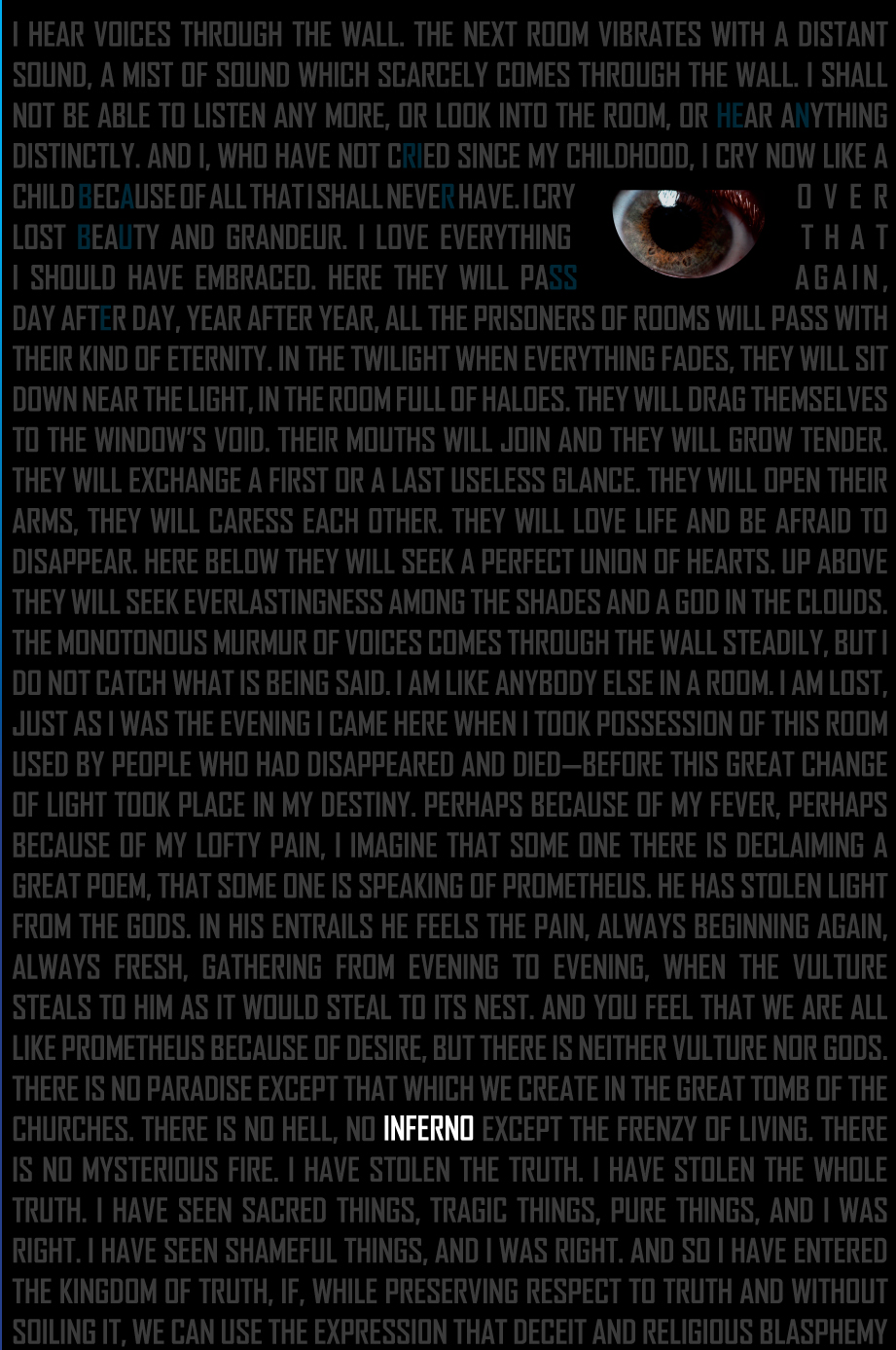 French novelist Henri Barbusse's early novel Inferno, from 1908, is a neglected classic of existentialism and voyeurism, if that's your cup of tea: a near stream-of-consciousness narrative from the point of view of a man peering through a gap in his boarding-house room wall at the goings-on in the neighbouring room. The oppressive ranting of the text and the peering eye suggested a design for this one (click for a better view--the text doesn't display well at the smaller size).