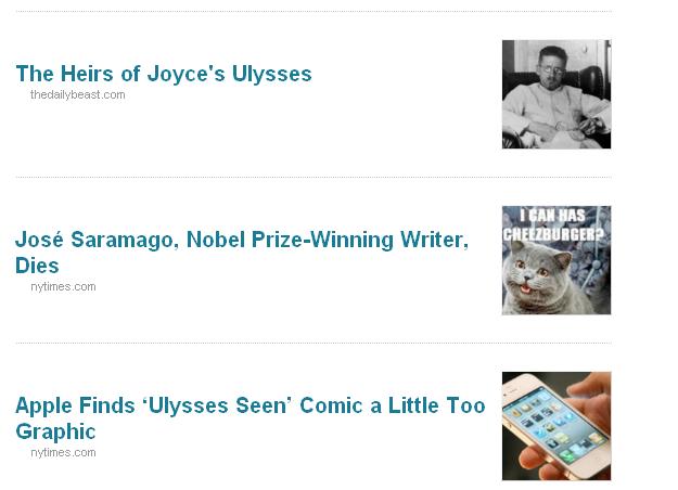 Speaking of the unexpected, I seem to have somehow signed up to a thing called Bookblips, which is some sort of social media/blog aggregating/news thing about books, which every week sends me a list of popular net articles about books. I do wonder at the software responsible for choosing images to go with the stories, though, as this is not necessarily the memorial José Saramago would have expected.